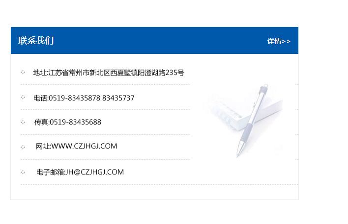 地址:常州市新北區友邦商務大廈1幢16、17層  電話:0519-85101652  傳真:0519-85112595  郵編:213022  網址:www.cz-jiayue_cn.qrw3.com  郵箱:xiajifengaa@163.com